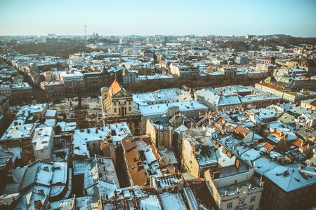 Winter panorama view from the Town Hall on the downtown in Lviv, Ukraine. Old buildings. Roofs covered with snow