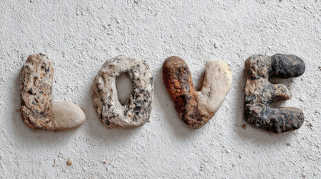 This artistic image features uniquely shaped stone letters that spell out love, set against a textured background. It embodies natural beauty and deep emotions.