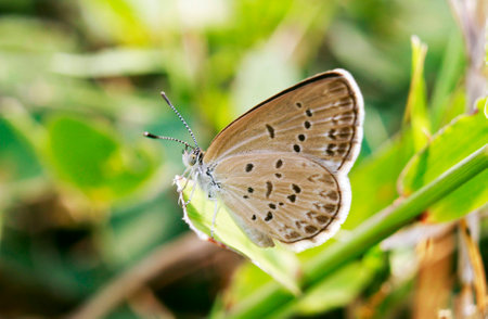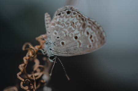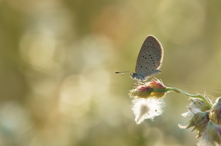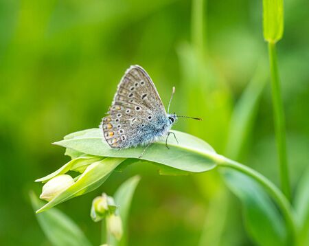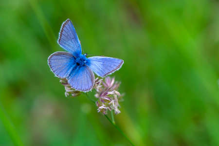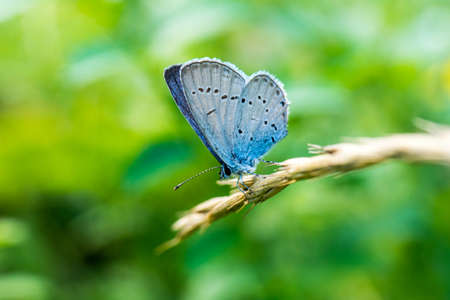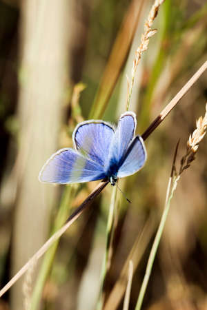 Little blue butterfly sitting on the grass. Wildlife nature macro photo.