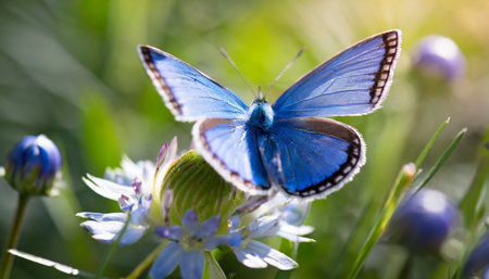 A stunning close-up image of a blue butterfly resting on a vivid flower petal, showcasing intricate wing patterns and details in a natural environment.