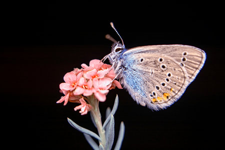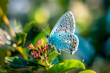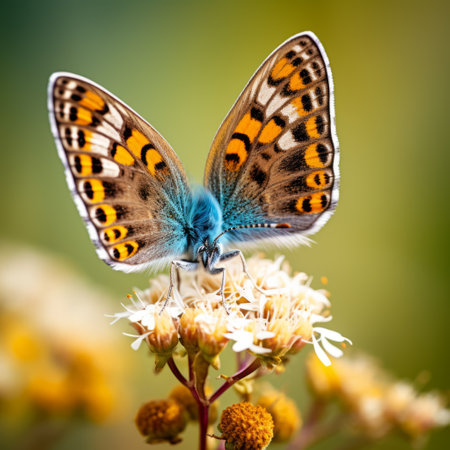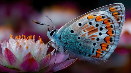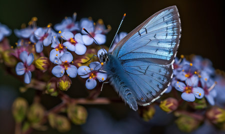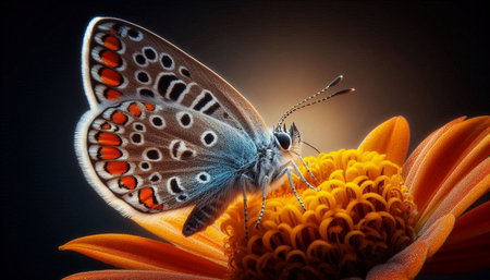 A close-up captures a butterfly resting on a flower. The butterfly displays intricate wing patterns with blue, orange, and black coloration. Soft lighting illuminates the scene, highlighting the textures and details of both the insect and the floral element. This image is suitable for various commercial uses, including advertising and editorial content.