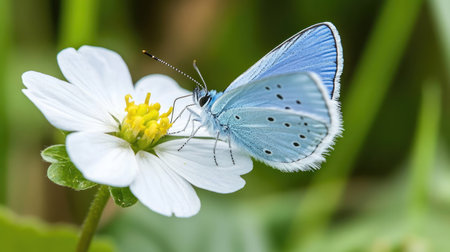 A delicate blue butterfly rests gently on a white flower, showcasing its vibrant colors and intricate details. A beautiful moment in nature.