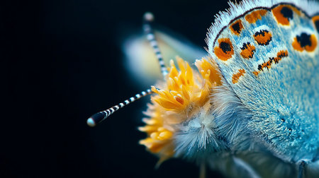 Detailed macro view of a vibrant blue butterfly wing, showcasing intricate orange and black markings and delicate fuzzy textures.