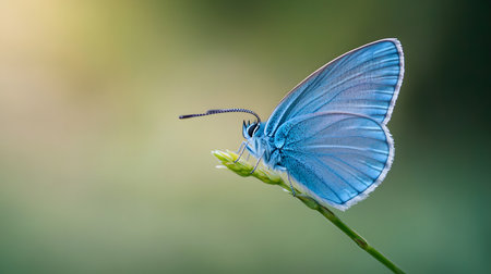 A vibrant blue butterfly rests delicately on a green plant stem. The soft bokeh background creates a serene and peaceful atmosphere.