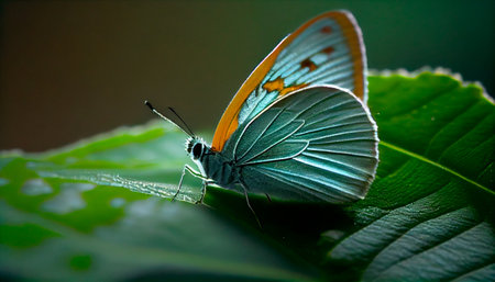 A close-up of a butterfly perched on a leaf, with morning dew drops glistening around it in the soft early light.