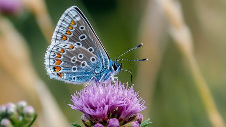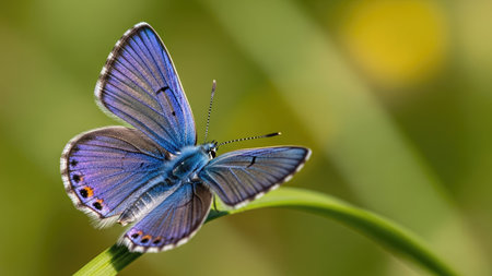 close-up of silver-studded blue (Plebejus argus) in natural environment. green blurred background. wings open