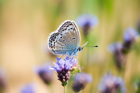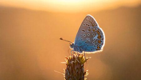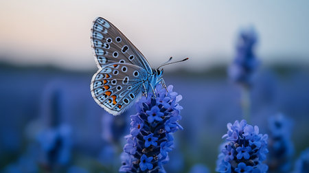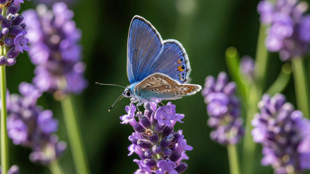 Blue butterfly resting on lavender blossom in a sunlit meadow during golden hour with delicate natural background.