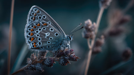 A detailed close-up shows a butterfly perched on a plant stem. The butterfly displays intricate patterns in shades of blue and orange. The image features soft lighting and a shallow depth of field, highlighting the insect. This image could be suitable for nature-related content or editorial use.