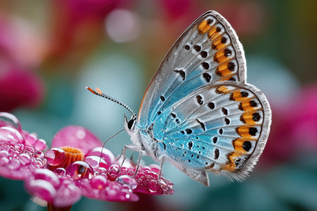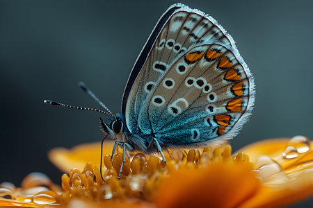 A detailed macro photograph showcasing a butterfly perched on an orange flower surrounded by glistening water droplets. highlighting the intricate patterns of the butterfly's wings, it emphasizes the beauty of nature and biodiversity. Generative AI