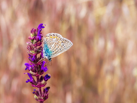 Light butterfly (Polyommatus icarus) with beautiful wings pattern on the purple flower (Salvia officinalis) with defocused soft background.