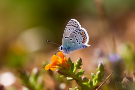 Macro of a common blue butterfly (polyommatus icarus) on a bladder campion bud (silene vulgaris) with blurred bokeh background; pesticide free environmental protection biodiversity concept;