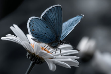 Stunning blue butterfly resting on a white daisy with a soft focus and elegant monochrome background