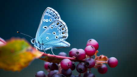 blue butterfly perched on a vibrant red branch, surrounded by other blue butterflies. this stunning photograph captures the meticulous details of the butterfly's wings in a photorealistic style. the cranberrycore color scheme adds depth to the image, while the macro photography showcases the intricate beauty of nature. shot with a nikon af600, the composition features a vivid color palette of dark white, light azure, and