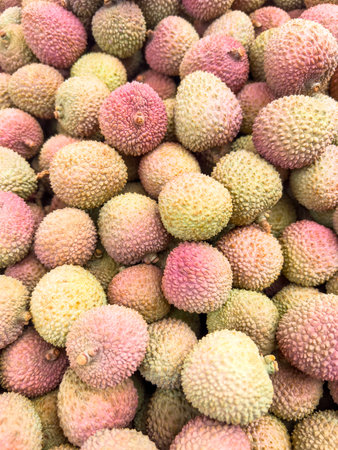pile of Fresh Lychee Fruits with Rough Pink-Green Skin in Natural Light on market.heap of Fresh Lychee Fruits with Rough Pink-Green Skin in Natural Light on market. Fresh lychee fruits with textured
