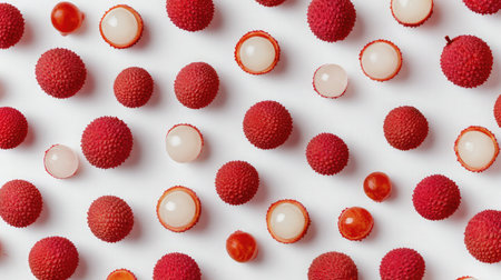 Clean layout of peeled and whole lychees spread out over a white surface
