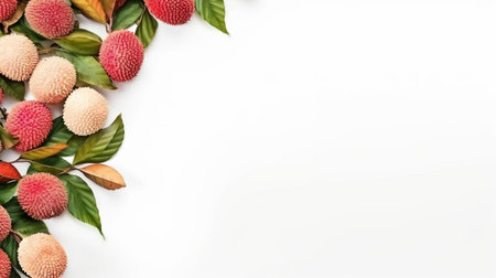 fresh lychee fruit rests on a rustic white chalkboard, surrounded by soft shadows, creating a stunning flat lay view banner perfect for summer fruit salads, healthy eating, and exotic cuisine inspiration, evoking feelings of tropical getaways and refreshing treats. ai generated