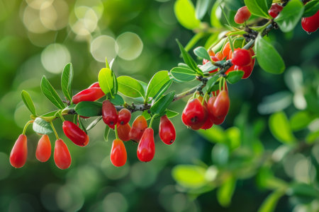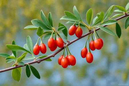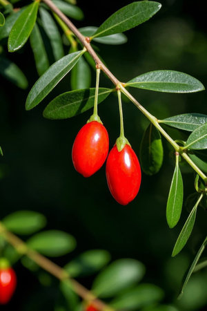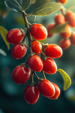 Fresh goji berries on a branch, vibrant red color, surrounded by green leaves