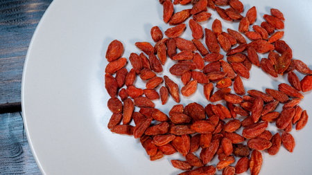 Discover the vibrant red color and unique textures of dried goji berries in this close-up image, ideal for promoting healthy eating and nutrition-focused products.