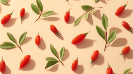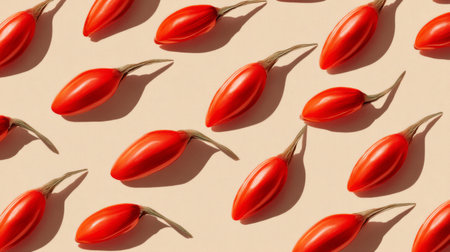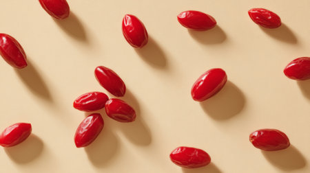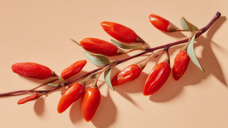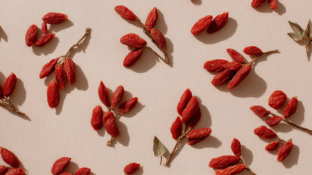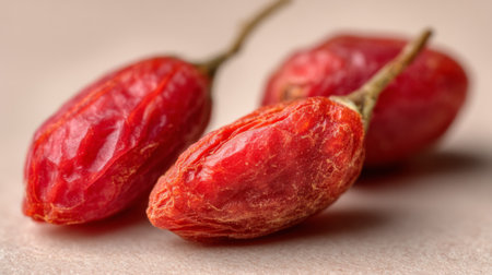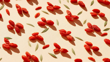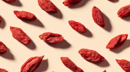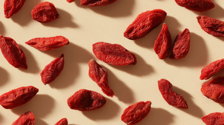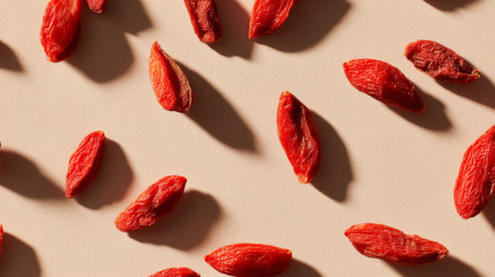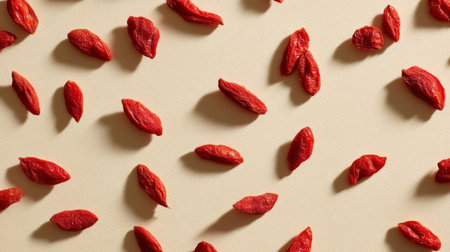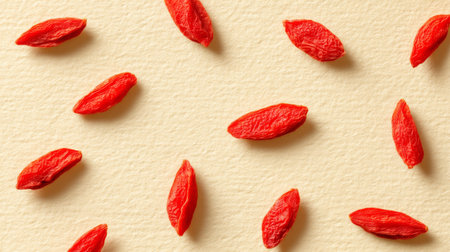 A captivating arrangement of vibrant red goji berries on a soft beige background, emphasizing their unique shape and texture in a minimalist setting. Ideal for health-focused themes.