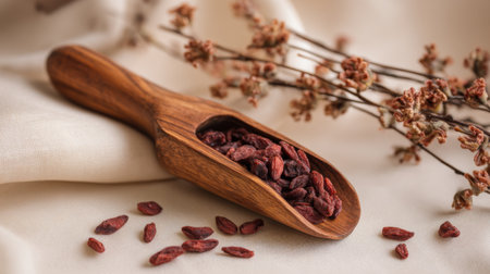 Close-up view of vibrant goji berries in a wooden scoop, complemented by delicate dried flowers on a beige fabric, capturing the essence of nature and nutrition.