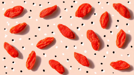 A collection of vibrant goji berries scattered on a soft pink background adorned with playful black dots, showcasing their unique texture and color, ideal for health-focused visuals.