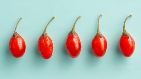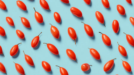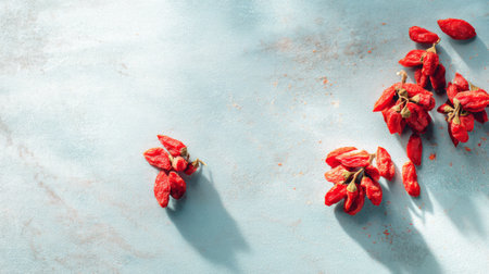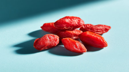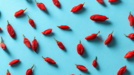 A beautiful arrangement of fresh red goji berries on a light blue surface highlights their unique shape and gives a vibrant touch to any healthy lifestyle aesthetic.