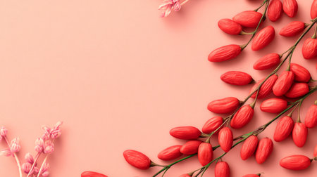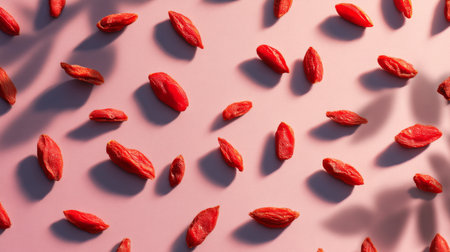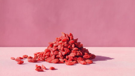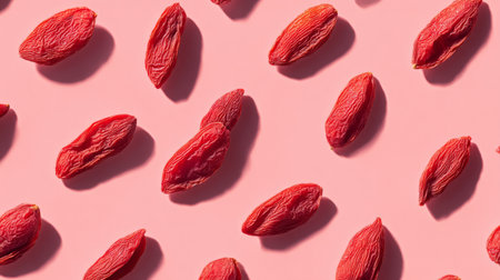 Discover the beauty of goji berries scattered artfully on a soft pink surface, capturing the essence of healthy eating with vibrant colors and rich textures.