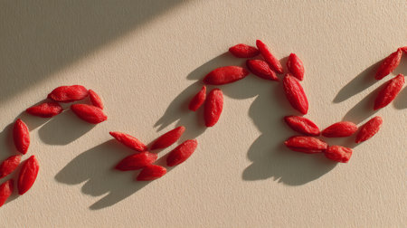A visually appealing display of goji berries artfully arranged on a neutral background, showcasing their vibrant color and casting interesting shadows, ideal for health themes.