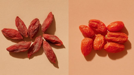 A stylish arrangement of goji berries on a neutral background highlights their vibrant color and shape, serving as a perfect visual for health and wellness themes.