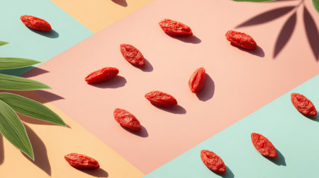 This image showcases dried goji berries artistically placed on a vibrant pastel background, complemented by lush green leaves. Ideal for health and wellness themes.