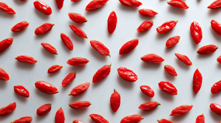 A visually striking arrangement of red goji berries scattered on a simple background, highlighting their rich color and unique shape, ideal for healthy living themes.