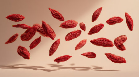 A stunning visual of goji berries suspended in mid-air, emphasizing their vivid colors and unique textures against a soft background, ideal for health and wellness themes.