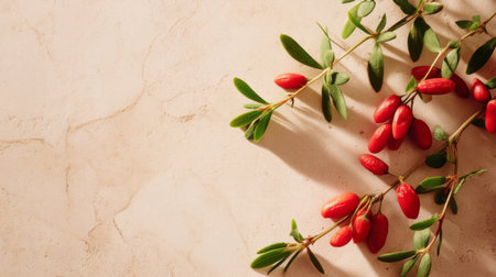 A striking arrangement of vibrant red fruits on a delicate stem, showcasing natural beauty and texture against a soft beige background, perfect for creative projects.