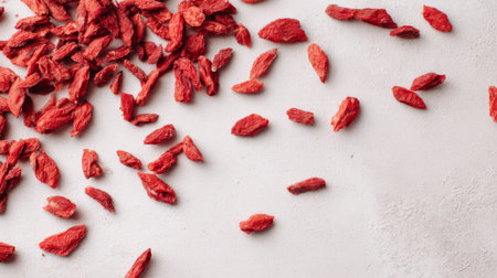 A vibrant arrangement of dried goji berries scattered across a light surface, perfect for illustrating healthy eating, nutrition, or culinary concepts in various designs.