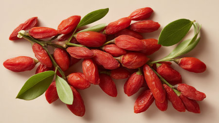 A stunning composition of vibrant red goji berries rests elegantly on a soft neutral background, complemented by green leaves. Perfect for health-focused imagery.
