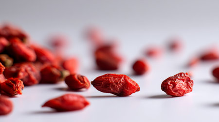 A beautiful display of goji berries on a light surface, highlighting their rich red hue and unique texture, perfect for promoting healthy eating and recipes.
