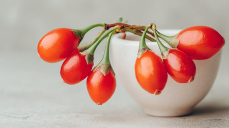 Explore the beauty of fresh goji berries elegantly displayed in a white bowl on a soft gray background, highlighting natural color and healthy choices.