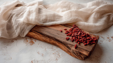 A beautifully styled wooden board showcases dried goji berries, paired with a soft linen cloth. Perfect for natural food photography and showcasing healthy choices.