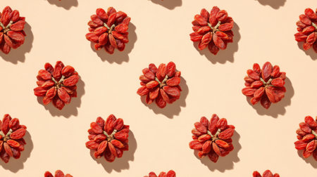 A captivating arrangement of red flower-like seeds on a smooth cream background, perfect for artistic projects, decoration, and culinary themes.