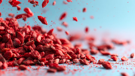Vibrant red goji berries create a lively composition against a light blue background, perfect for health and culinary themes, symbolizing freshness and nutrition.