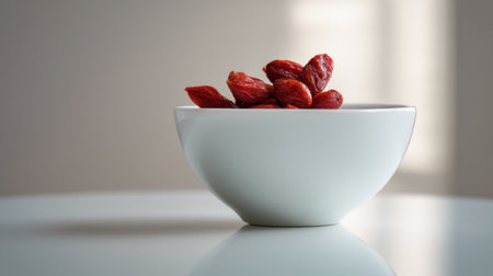 A serene image featuring fresh goji berries in a minimalist white bowl, set against a softly lit background. Ideal for promoting healthy eating and vibrant lifestyles.