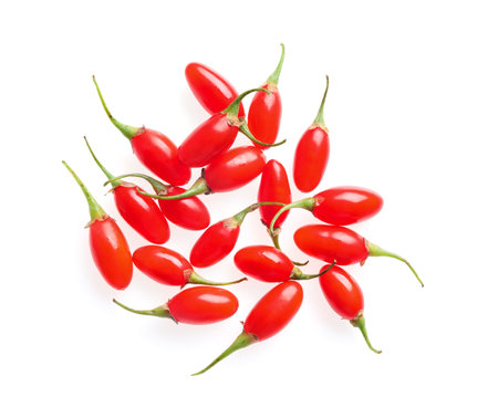 Bright red goji berries with fresh green leaves covered in dewdrops on a white background vibrant and juicy