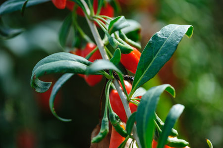 Close-up of red goji berries and green leaves on the branches