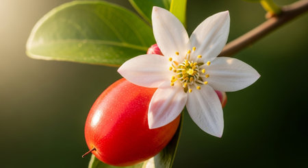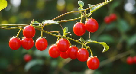 A branch adorned with bright red berries captures the warm sunlight, surrounded by rich green foliage. The natural tranquility exudes a sense of freshness in this serene garden atmosphere.
