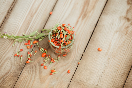Tibetan goji berries contain many useful substances, vitamins and minerals on wooden table