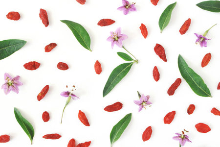 Closeup of Goji berries, Lycium barbarum. Dried Asian fruit, leaves and blossoms isolated on white wooden background. Healthy superfood. Floral pattern. Flatlay, top view.