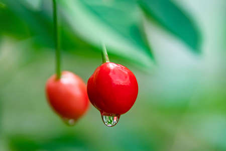 cherry tree and cherries on the branch with raindrops