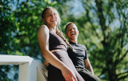Carefree Couple Laughing by Water at Twilight with Warm Ambient Glow
