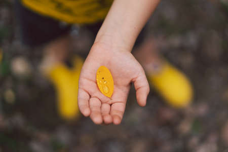 The boy is holding a yellow leaf with water drops in his hands. Autumn mood.
