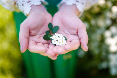 Female hands holding white tiny spirea flowers. Springtime blooming and new life concept.